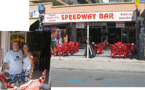 This week’s chosen venue for Benidorm Focus is a bar which has only been open a short while but is attracting a lot of interest through its name. Situated on Avenida Del Periodista Escritor Emelio Romero (which must be the longest street name in history) nestling between Av Mediterraneo and Calle Gerona near the Hotel Diplomatic is the Speedway Bar. The owners Chris and Danielle from Leicester took over the bar in March 2008 and as you would expect based it on a theme of Speedway. The idea came from Chris who is an avid fan of the motor sport and as there is nowhere in Benidorm with a Speedway slant that’s what they decided upon.